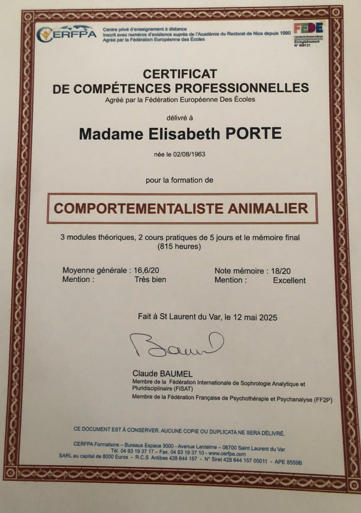 Comportementaliste n’est pas mon premier métier. J’ai en effet longtemps servi au Ministère des affaires étrangères. Parallèlement, j’ai toujours soutenu la cause animale en m’investissant, pendant mon temps libre, dans diverses actions de soutien et d’apprentissage auprès de professionnels en comportement et/ou éducation, y compris lorsque j’ai séjourné à l’étranger.